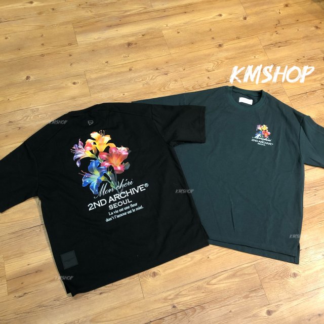韓國 2ND ARCHIVE 花花tee 黑/軍綠